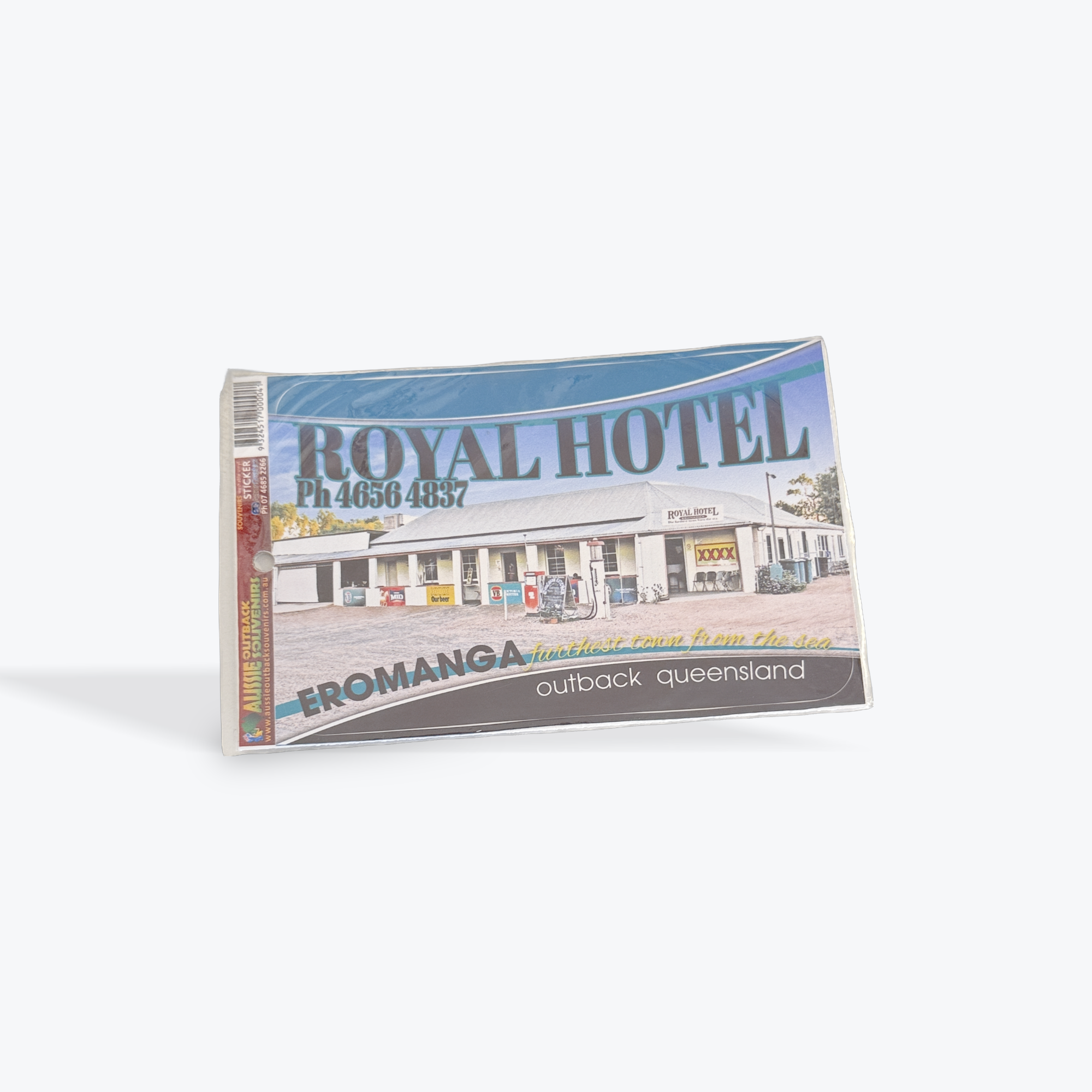 Royal Hotel Branded Country Trucker Cap $35.00 Black and Grey Pink and Navy Red and Navy Add To Cart Added! Royal Hotel Stubbie Cooler $15.00 Add To Cart Added! Eromanga Souvenir Metal Number Plate $30.00 Add To Cart Added! Pilbara Cobalt Blue Workshirt with Royal Hotel Logo $60.00 View Options Outback Charm Mini Number Plate Magnet $10.00 Add To Cart Added! Australian Bush Pubs Coffee Table Book $50.00 Add To Cart Added! Royal Hotel Eromanga Bumper Sticker $5.00 Add To Cart Added! Royal Hotel Eromanga Hat Pin Souvenir $10.00 Add To Cart Added!
